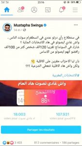 وأورد أن نتائجه أبرزت أنه من 120 ألف مغربي شارك في الاستطلاع، يوجد حوالي 100 الف يرفضون التصويت.